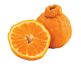 This fruit, developed in the 1970s from a cross between a mandarin and an orange, originated in Japan, where it’s known as dekopon. It’s easy to recognize due to the protruding bump at the top, reminiscent of a sumo wrestler’s hair bun. This juicy citrus has a flavour that’s more complex than that of clementines and is seedless.